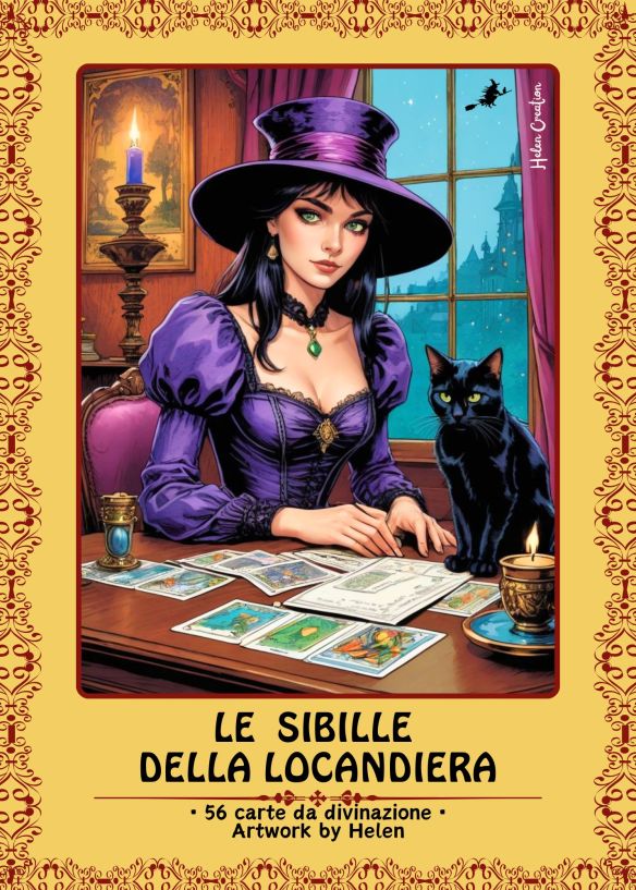 L’ispirazione del nome è nata da un pensiero che ho avuto relativamente a quando si leggevano le carte nei paesini, ho immaginato che ci fosse un luogo dove la cartomante si poteva appartare con la cliente e ho pensato che forse in una bella locanda e in un angolo di un salottino ci potesse essere un bel tavolo in legno con una grande finestra adatta a fare quindi i consulti con riservatezza e calma.  Da qui l’immagine della carta n.23  appunto “La cartomante”.  Immagine poi utilizzata come look pubblicitario e sul manuale istruzioni.  Un’immagine tra l’altro ricca di particolari esoterici e direi anche “felini” qui vorrei ricordare ai miei clienti che è nato il nuovo mazzo delle “Sibille delle Gattare” per tutti gli amanti dei gatti.
