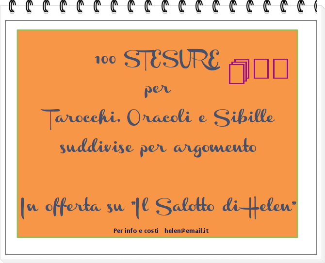 Ciao, per la prossima settimana, dal 30/1 al 5/2/2017 ho pensato di offrire la carta del giorno gratuitamente a chi fosse interessato. Sarà una carta sull’amore o sul lavoro….sarà la vostra carta del giorno, specialissima come sempre. Chi desidera aderire gratuitamente può inviare un messaggino con whatsapp al n. 327/6873780. Un abbraccio Helen (verranno accettate le prime 10 richieste)